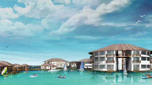 平面上に10室の宿泊ルームを円形状に配置し、ベッドスペースとリヴィングスペースの各々に窓を配置し開放感のあるものにする。このレイアウトの弱点は外壁の周長が長くなる一方で、円形の建物の中心部がデッドスペースになってしまう。そこでこのスペースにアトリュームを設け、そこには海水を導き入れ船着き場として利用する。天井部分にはあえて屋根はかけない。開け放された天井部の開口からは、南国の日差しだけでなく、時にはスコールも降り注ぎ、雨滴が跳ねる海水面に浮かぶ小舟は波しぶきをあげながら揺れる。こんな光景が、今求められているリゾートホテルのテイストではないだろうか。アプローチのために設けれた開口部は極力狭め、明るい日差しから一瞬日差しが奪われたのち、内部空間の天井開口部からの日差しに目がくらむ。こうした光のシークエンスを楽しめるのも南国の魅力ではないだろうか。円形の建物にはボートやヨットが入りこめる開口部を設け、時にはこうした交通によってホテル内の施設を楽しむなどの“非日常的体験”、きっとこれこそがリゾートならではのよろこびなのだと考える。この平面形を二層に積み上げ、20室、三層のもので30室、この両者の組み合わせで計50室、さらにこの組み合わせを3組にすれば合計150室の客室数を確保することができる。二層のヴォリュームはもちろん三層のヴォリュームでも十分ヒューマンなスケールを維持することができる。また通常売りにくい一階のユニットが親水性と言う魅力を持ち同時にセキュリティーとプライバシーも確保することができる。さらに30ユニット程の水上コテージも設けている。リゾートとしてのテイストを損ねずプロジェクト全体で180室、シティーホテル並みに客室数を確保できることをこのデザインは可能にする。